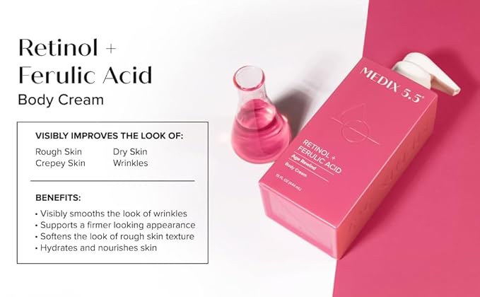 - NOURISHING INGREDIENTS FOR SMOOTHER LOOKING SKIN โ Medix 5.5 Retinol Body Lotion Moisturizer Cream is the perfect combination of ingredients with natural-antioxidants to help promote a visibly radiant complexion and a more youthful look. Infused with Retinol, Ferulic Acid, Shea Butter, Vitamin E, Green Tea, & more to nourish skin, visibly enhancing its texture and tone. This blend promotes a smoother, more youthful appearance.