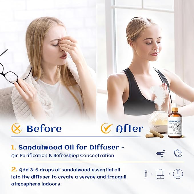 - Multiple Usage Scenarios: 1-2 drops of Sandalwood essential oil in a diffuser can help create a calm and relaxing atmosphere, suitable for yoga, meditation, massage, aromatherapy, sauna, spa, bedroom, living room, bathroom, shower room