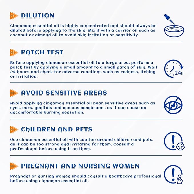 - Body Massage: Mix 1-2 drops of cinnamon essential oil with every 20 milliliters of a carrier oil (such as sweet almond oil, jojoba oil or castor oil). Take an appropriate amount of the mixture into your palm and apply it to the desired body area in a circular motion for massage, bring a comfortable experience to the body