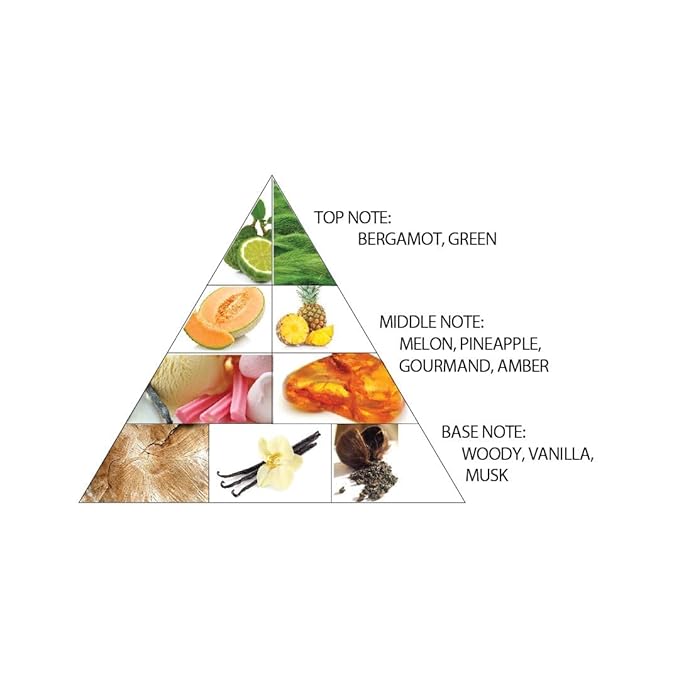 - Scent : Vanilla, Pineapple, Bergamot, Melon, Amber, Musk, Woody Accord