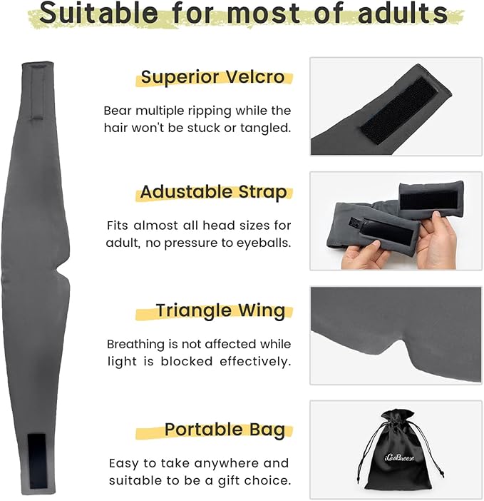 - Large Size & Adjustable: The eyemask is with Large Size to fit most head circumference and side-sleepers. You may adjust the strap to your suitable length via the Velcro, and the mask will no shift off easily. You won’t feel any pressure on your face or your eye balls with this sleep face mask, and we believe that you will want to use it in the long term