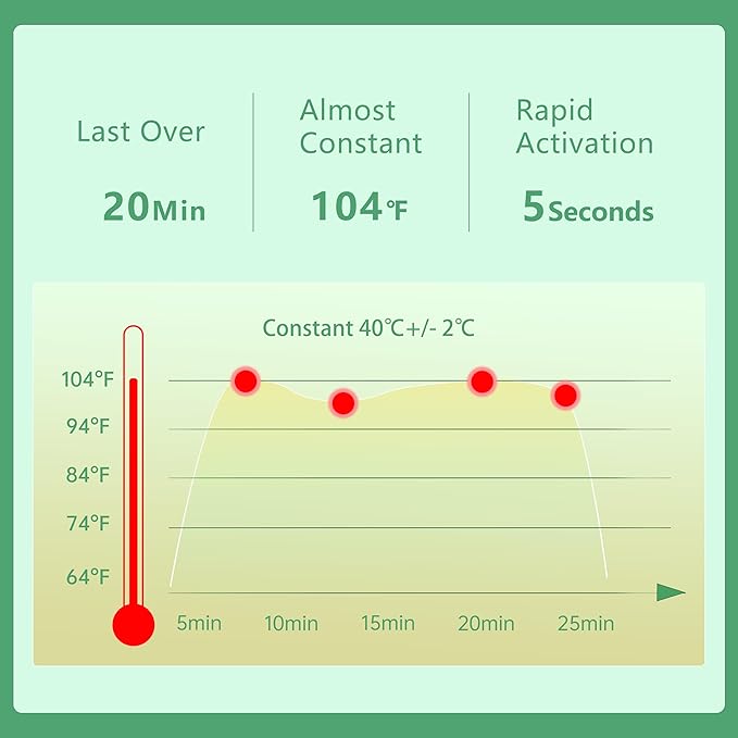 - Patented & Stable -- The eye soother masks gain patented ultra thin self-heating cell, last for about 25minutes with constant temperature of 40โ(104F), as well as gentle but dense steam. Warm and wet vapor helps better rejuvenate tired eyes, improve micro-circulation around your eyes, and promote absorption of eye creams, allowing you to enjoy face spa anytime and anywhere