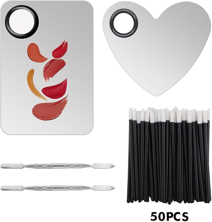 - 【PACKAGE CONTENT】You will receive 2pcs spatulas, 1pc heart-shape makeup mixing palette, 1pc rectangle makeup mixing palette and 50pcs disposable lip brushes, enough for your daily makeup needs.