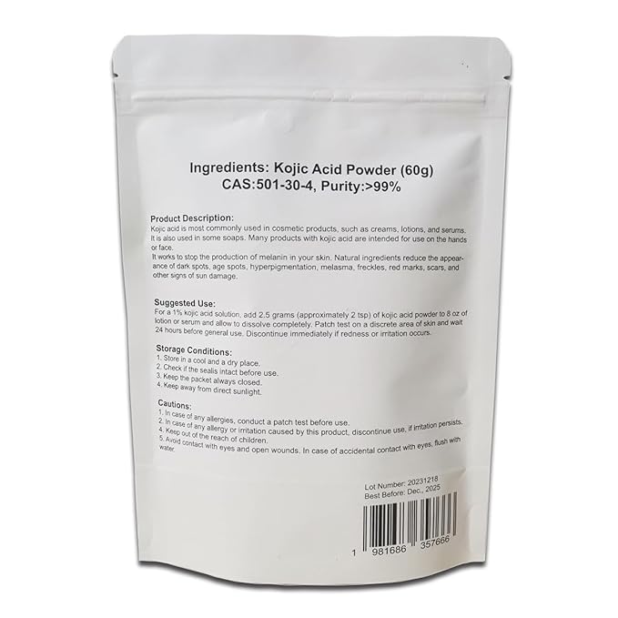 - Packaging: Double Layer packaging; A measuring scoop inside( around 1g per scoop of the kojic acid powder).