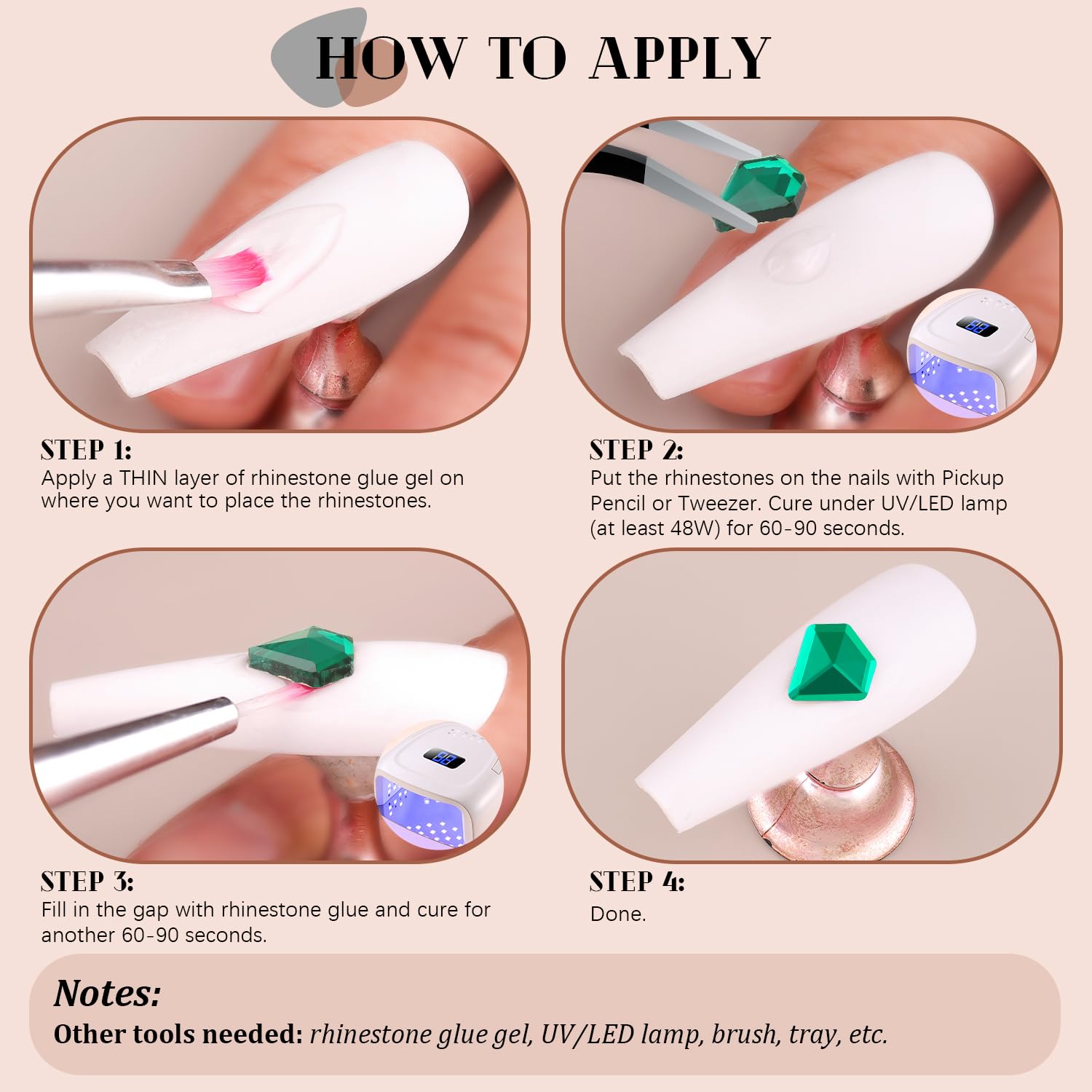 - đź’ŽEASY TO USE -- Easy to apply on artificial nails. After applying nail polish and applying enough gel on the nails, simply use the equipped tools (pickup pen + tweezers) to pick up the crystals onto your nails to create your fabulous DIY designs! These crystals gemstones are different from those hotfix stones, they are not self-adhesive, you have to apply glue to stick them (glue is not included.)