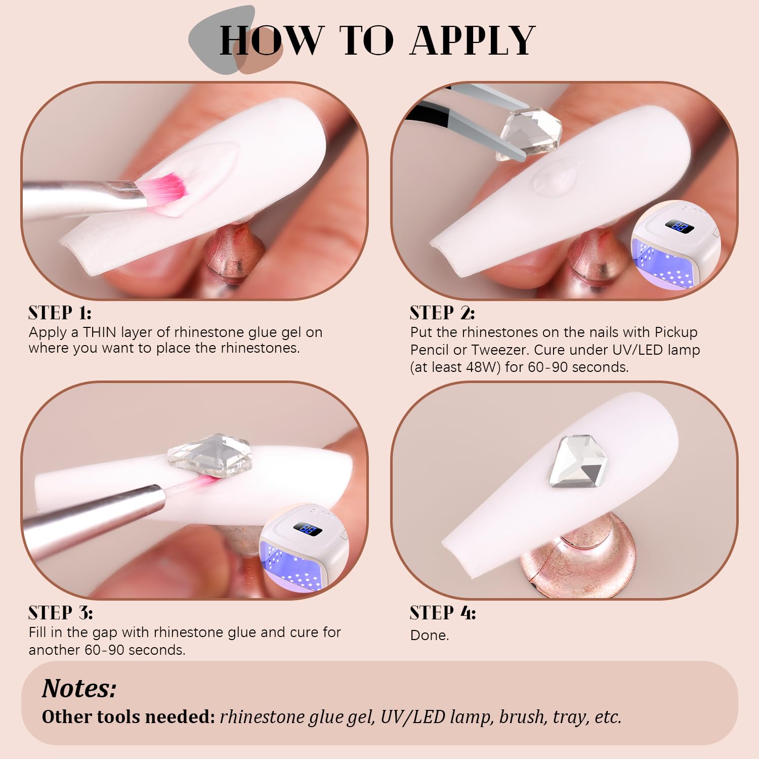 - đź’ŽEASY TO USE -- Easy to apply on artificial nails. After applying nail polish and applying enough gel on the nails, simply use the equipped tools (pickup pen + tweezers) to pick up the crystals onto your nails to create your fabulous DIY designs! These crystals gemstones are different from those hotfix stones, they are not self-adhesive, you have to apply glue to stick them (glue is not included.)