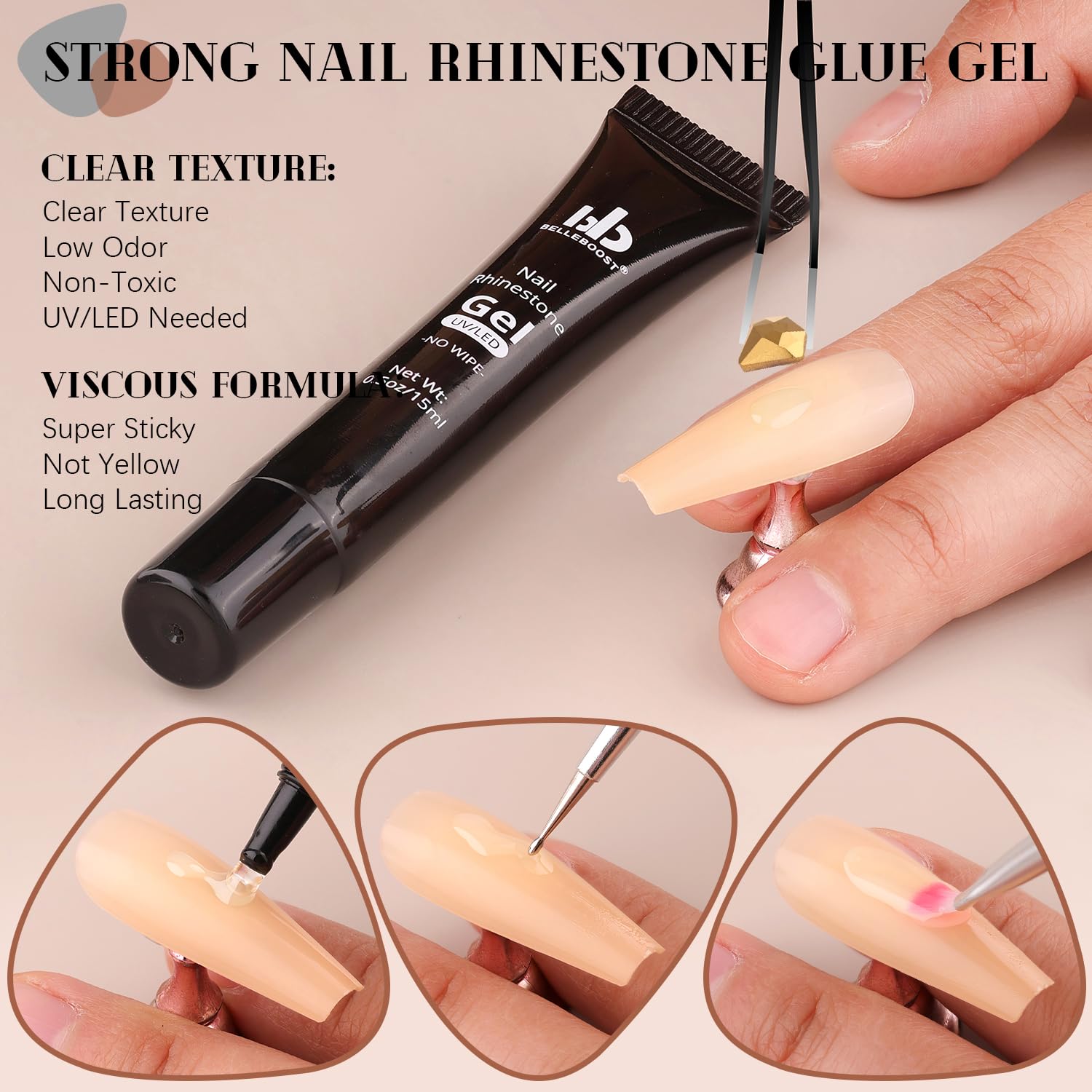 - đź’ŽADHESIVE GEL GLUE: The rhinestones glue gel uses a special, non-toxic and eco-friendly formula with strong tackiness, adhesion, and fluidity for easily applying decorations. It is a type of UV gel glue. After proper curing under a UV/LED lamp, the glue dries clear with superior bonding strength that can last a few weeks without falling off. With the designed tip, you can easily and conveniently apply the glue to the nail bed or the surface of false nails.