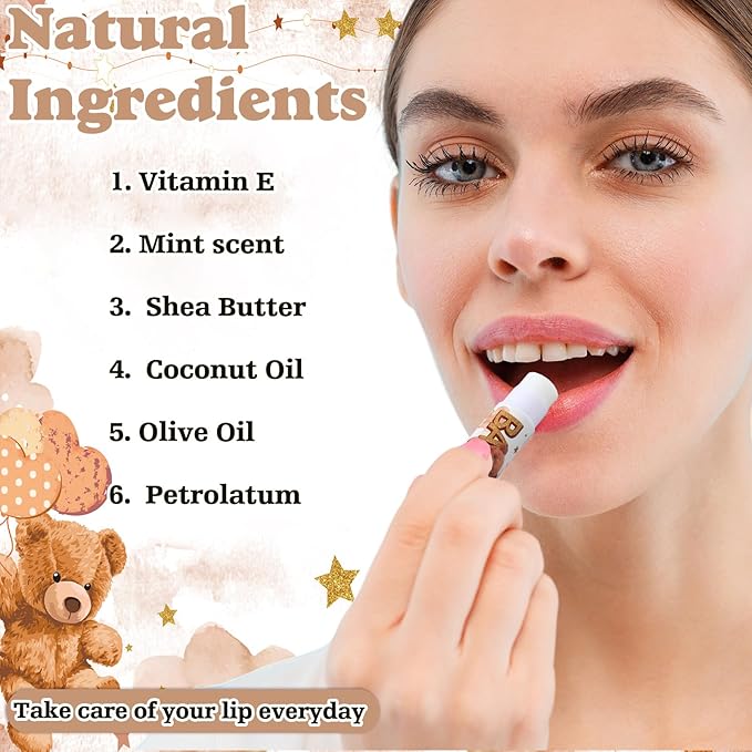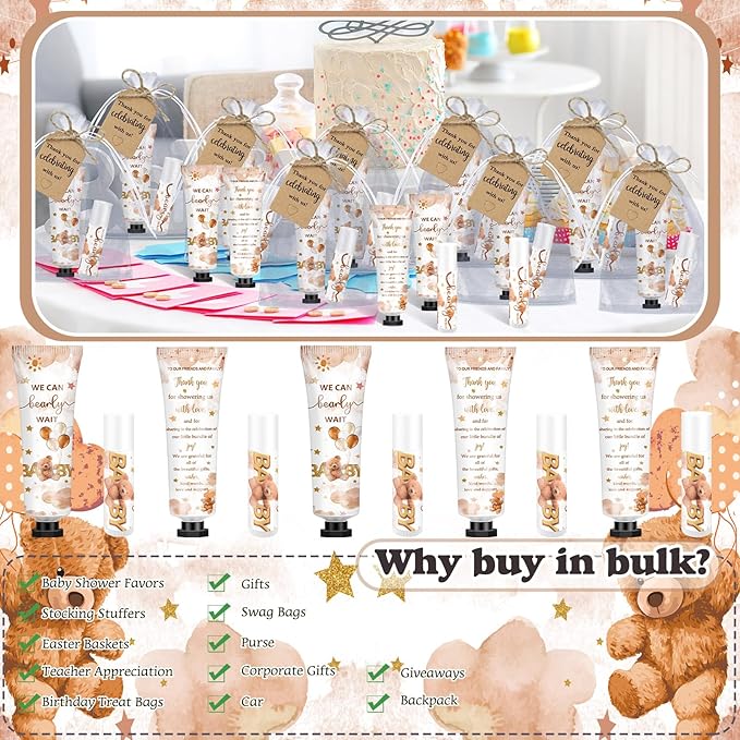 - Cute Little Bear Themed Design: charming borwn bear and balloon patterns are ushers of positivity while the warm and thankful words like [ we can bearly wait baby] , enhance the gift giving atmosphere; This ensemble of hand lotion and lip balm lifts up the charm quotient of any event whilst bringing a sense of unexpected joy
