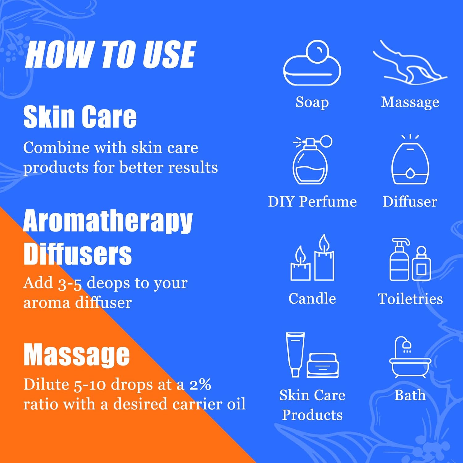 - 【EVERYDAY ESSENTIAL OILS】You can use our essential oils not only in essential oil diffusers, air fresheners, clothing scenting, soap making products, but also in daily skincare, bath and hair care and many more DIY creations!