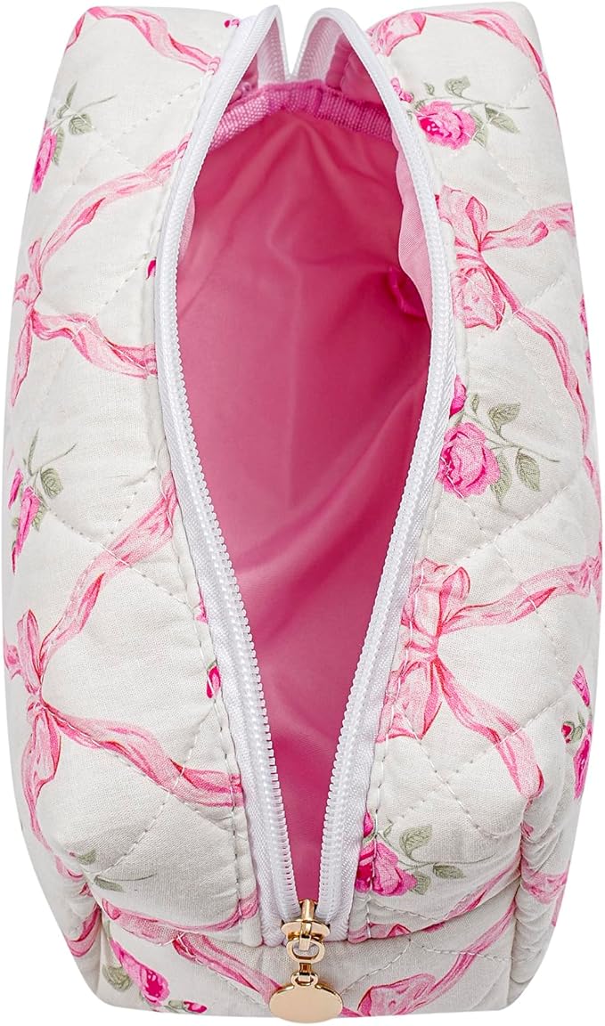 Makeup Bag Travel Cosmetic Bag for Women Girls, Zipper Make Up Pouch, Floral Flowers Toiletry Organizer Makeup, Portable Storage Bag, Cosmetic Travel Cloth Bag (2 Pack (L+S)/Pink Bowknot)