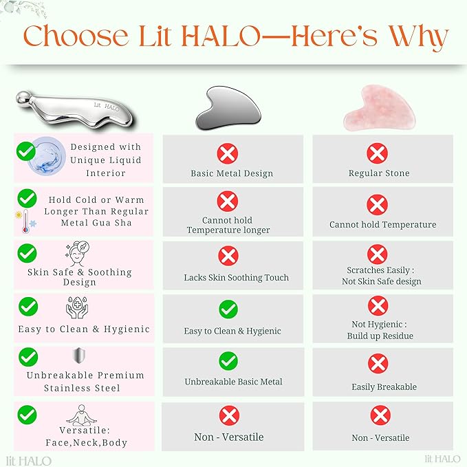 - HYGIENIC AND DURABLE: Lit HALO Gua Sha is crafted from 304 stainless steel, designed to enhance lymphatic drainage and improve circulation. Unlike jade or quartz, stainless steel is more durable, hygienic, and long-lasting, making it a perfect choice for everyday use.