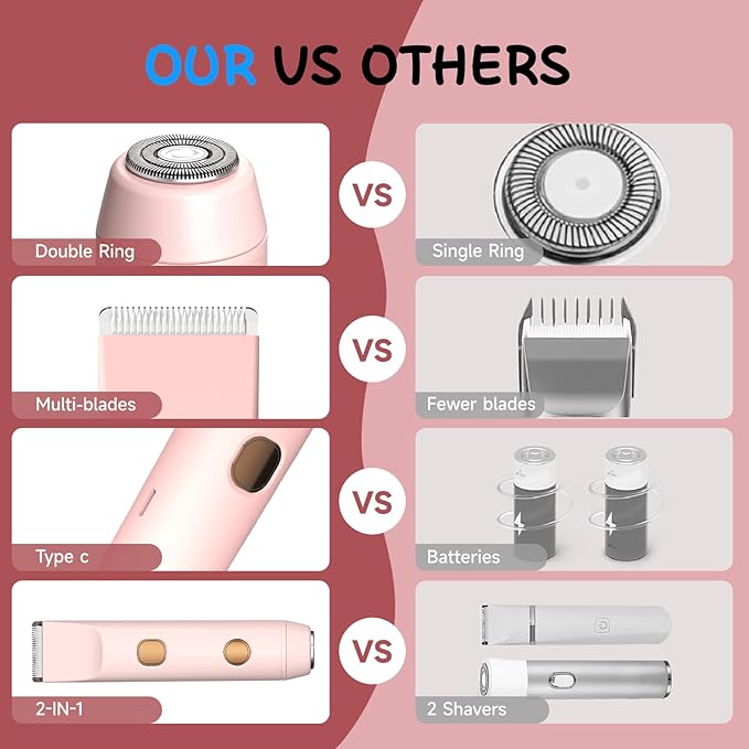 - 【2 in 1 Bikini Trimmer】2 in 1 women electric shaver dual head precision shaver is specially designed for women, the straight head trimmer is designed for body shavers, perfect for larger areas and longer hair, such as arms, legs, armpits, bikini, etc. The round head trimmer is a facial shaver, perfect for removing shorter hair, such as hair on cheeks, chin and upper lip